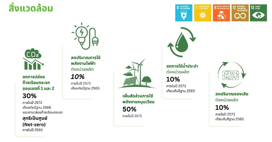 - ดำเนินธุรกิจอย่างมีความรับผิดชอบต่อสิ่งแวดล้อม: ให้ความสำคัญต่อการเปลี่ยนแปลงสภาพภูมิอากาศ ลดการใช้พลังงาน เพิ่มสัดส่วนการใช้พลังงานหมุนเวียน ส่งเสริมแนวทางการผลิตและบริโภคที่ยั่งยืนให้มีการใช้ทรัพยากรน้ำและวัตถุดิบอย่างมีประสิทธิภาพและสนับสนุนเป้าหมายการปล่อยก๊าซเรือนกระจกเป็นศูนย์ (Net-Zero Emission)