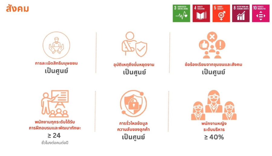 - ดำเนินธุรกิจอย่างมีความรับผิดชอบต่อสังคม: เคารพและปฏิบัติตามหลักสิทธิมนุษยชนสากลตลอดห่วงโซ่คุณค่าพัฒนาศักยภาพของพนักงานทุกระดับ และจัดให้มีสภาพแวดล้อมและมาตรฐานการทำงานที่ปลอดภัย รวมทั้งสร้างโอกาสที่ดีและประโยชน์ที่ยั่งยืนให้แก่ชุมชนและสังคม