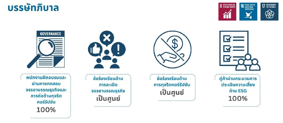 - ดำเนินธุรกิจตามหลักการกำกับดูแลกิจการที่ดี: ดำเนินงานอย่างมีคุณธรรม จริยธรรม และโปร่งใสมีการบริหารความเสี่ยงและการควบคุมภายในที่เหมาะสม มีการพัฒนาคุณภาพของผลิตภัณฑ์และการบริการ และส่งเสริมการพัฒนานวัตกรรมทางธุรกิจเพื่อสังคมและสิ่งแวดล้อมรวมทั้งตอบสนองต่อความต้องการและความคาดหวังของผู้มีส่วนได้เสียทุกกลุ่มอย่างสมดุล