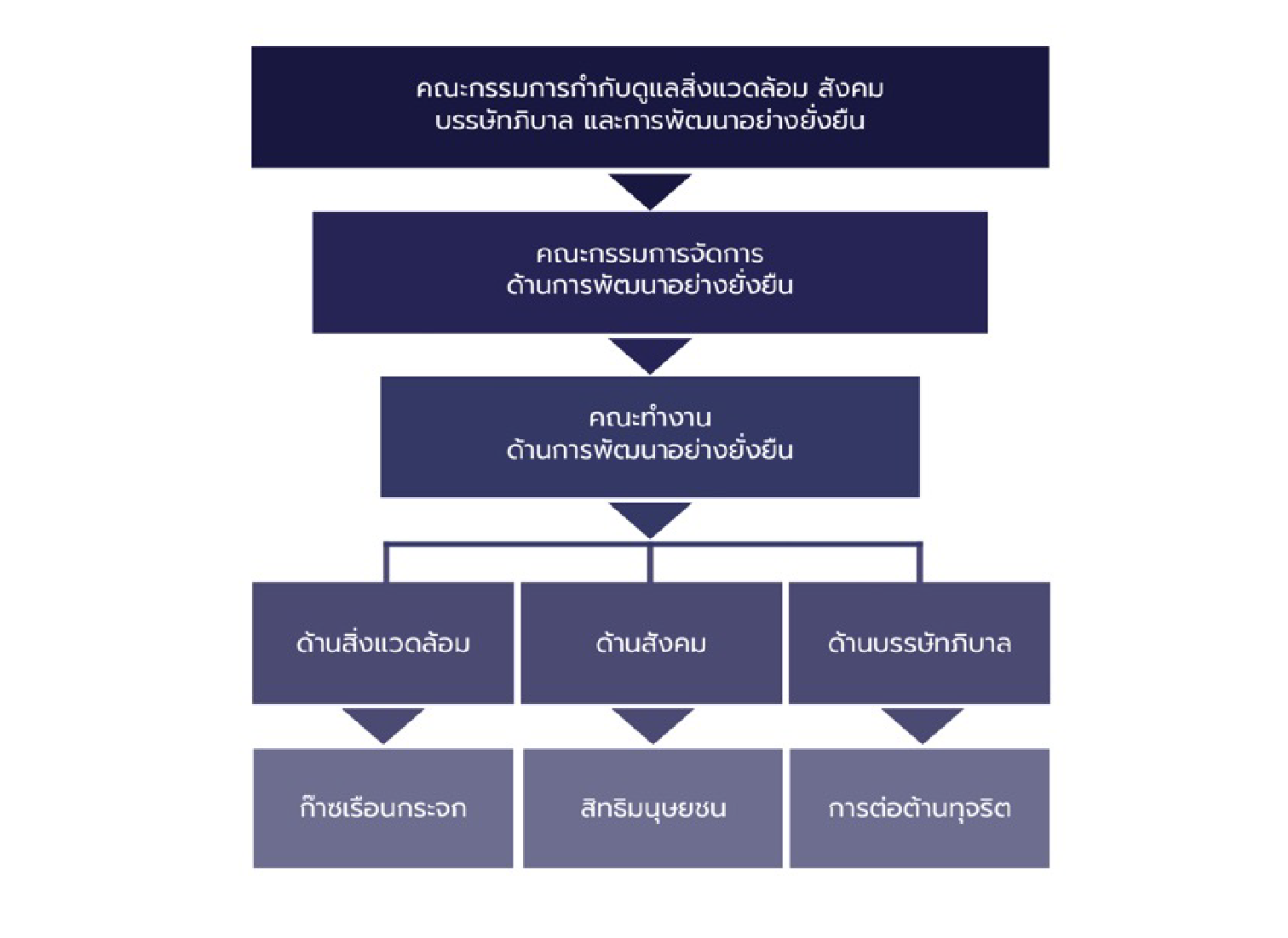 คณะกรรมการกำกับดูแลสิ่งแวดล้อม สังคม บรรษัทภิบาลและการพัฒนาอย่างยั่งยืนจัดตั้งคณะกรรมการจัดการด้านการพัฒนาอย่างยั่งยืนโดยแต่งตั้งผู้บริหารระดับสูงจากทุกฝ่ายของบริษัทเพื่อให้การดำเนินงานเป็นไปตามนโยบายและเป้าหมายการพัฒนาอย่างยั่งยืนซึ่งมีโครงสร้างตามแผนภาพดังนี้