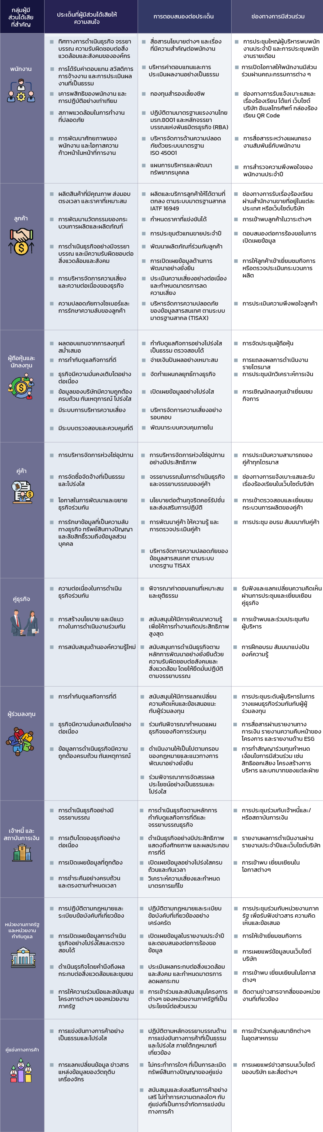การดำเนินธุรกิจในปัจจุบันเป็นการเชื่อมโยงการดำเนินงานของบริษัทไปยัง ห่วงโซ่คุณค่า (Value Chain) ซึ่งครอบคลุมผู้มีส่วนได้เสีย(Stakeholders)ตั้งแต่ผู้จัดหาวัตถุดิบ คู่ค้า พนักงาน ลูกค้า จนถึงสังคมและสิ่งแวดล้อม ซึ่งผู้มีส่วนได้เสียแต่ละกลุ่มมีบทบาทและผลกระทบต่อธุรกิจที่แตกต่างกัน การจัดการผลกระทบต่อผู้มีส่วนได้เสียในห่วงโซ่คุณค่าจึงเป็นปัจจัยสำคัญที่ช่วยให้ธุรกิจเติบโตอย่างยั่งยืน และเสริมสร้างความสัมพันธ์อันดีระหว่างองค์กรกับทุกภาคส่วน รวมทั้งช่วยสร้างความไว้วางใจ และลดความเสี่ยงที่อาจเกิดขึ้นจากการดำเนินธุรกิจ ไม่ว่าจะเป็นด้านสิ่งแวดล้อม สังคม หรือธรรมาภิบาล